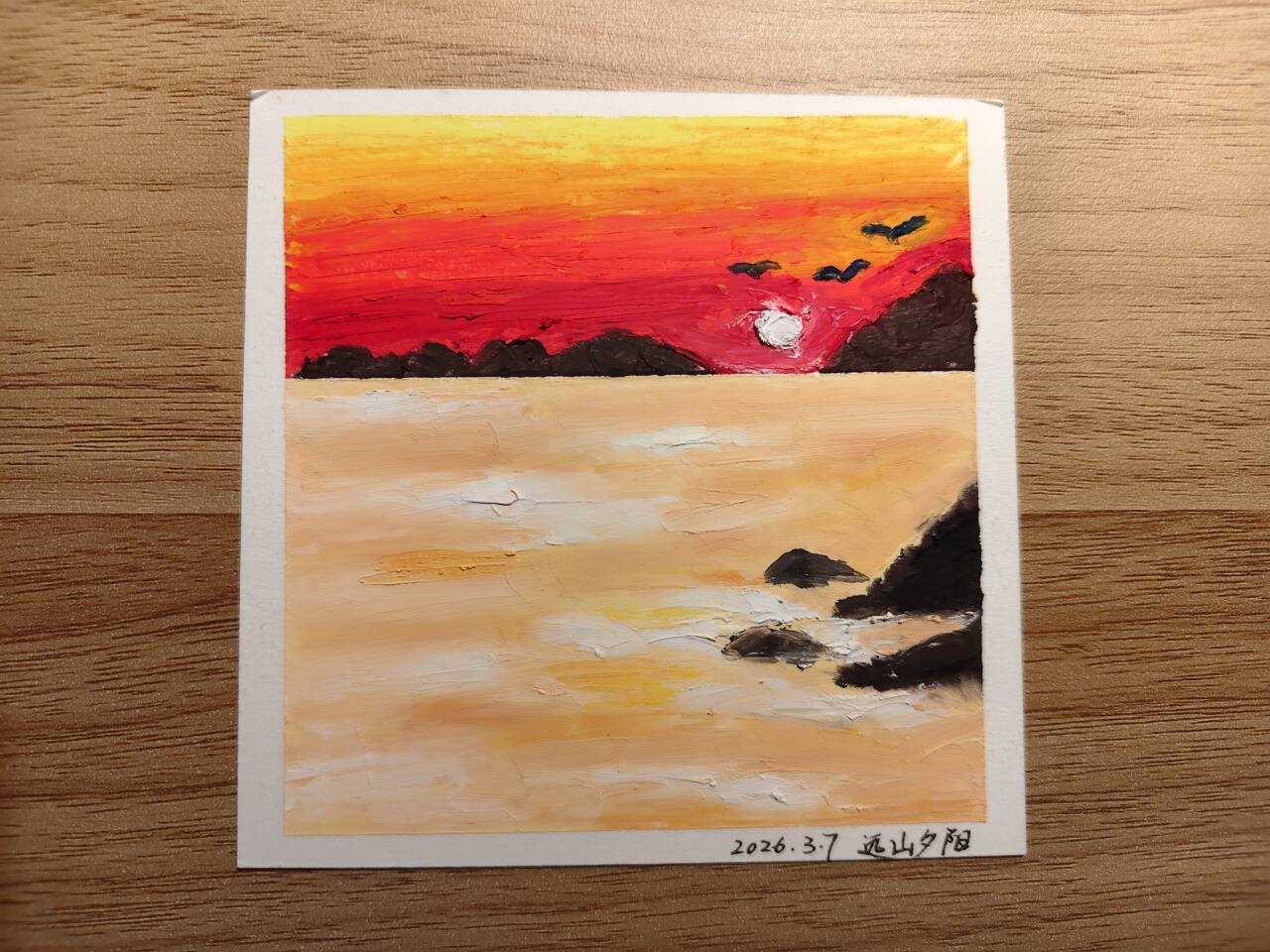 我的绘画小仓油画棒绘画夕阳远山夕阳flowwalker2026-03-072026-03-16 远山夕阳🌇赤染长天落晚晴,金波漾碎一舟轻。归鸿数点随云去,石畔潮声伴月明。天色红得深沉,晚晴庄严。浪打礁石,波光阵阵。归鸿飞入云堆,或者潮声留在石畔,何关紧要?只是,当月亮升起来的时候,你是否还记得,刚才那场落日究竟是为了谁而灿烂?